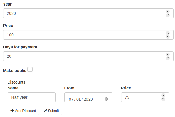 If you want a half-year membership fee, click in the Add Discount button. There you can name the discount, from when it should start, and the price. A membership fee automatically starts 1 st January and ends 31th December (if a discount is added it also ends then). The full membership fee is named Full Year, so a suggestion is to call the discount Half Year.