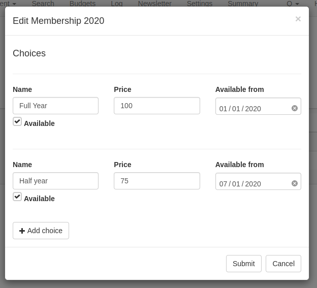 After setting everything up, click the Submit button to create the Membership fee. If you filled in the Make public checkbox the Membership fee will be published straight away, otherwise you will have to go to the Active courses page and publish it.
