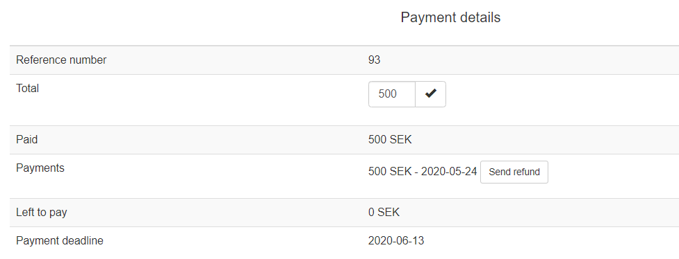All registrations can be paid via Swish, directly in the system. This way all the administration is handled automatically. If a person has made a swish payment, a button called Send refund appears next to the Payment information found for that registration. To refund swish payments simple click that button, and define the amount to refund. You can only refund up to the amount that was paid in, and if the person has made two separate swish payments you have to refund twice. It is also possible to only refund parts of the sum.